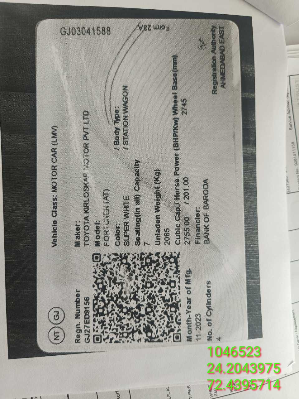 Reg. No : GJ27ED9156