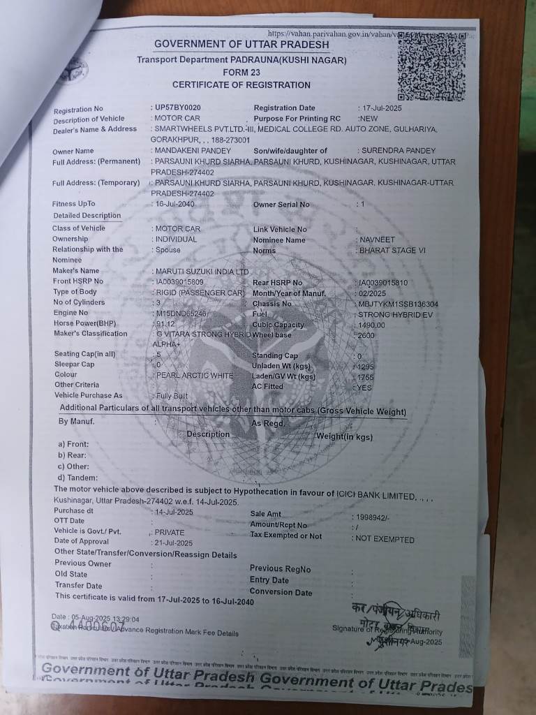 Reg. No : UP57BY0020