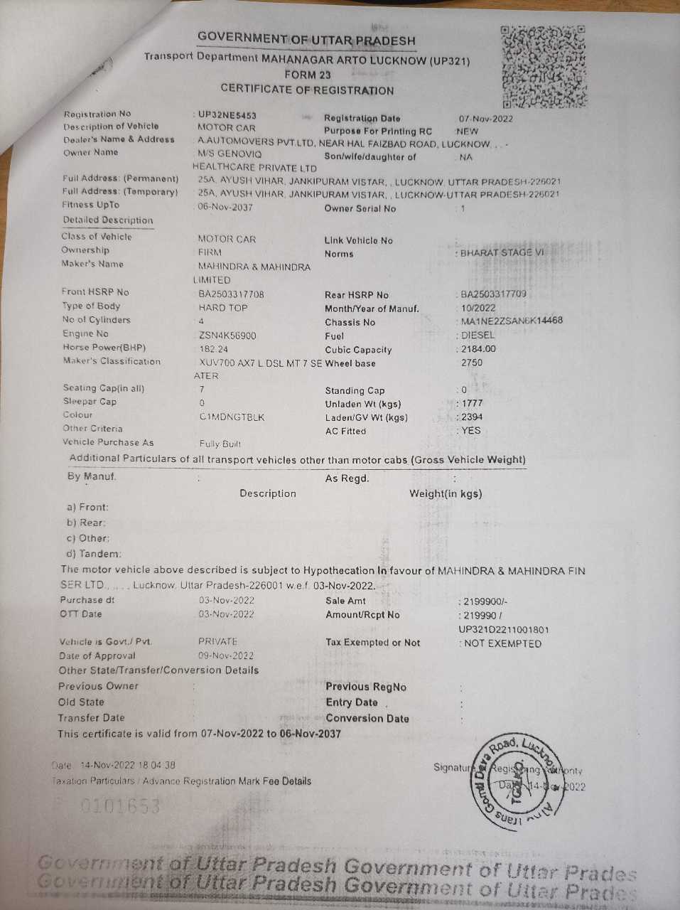Reg. No : UP32NE5453