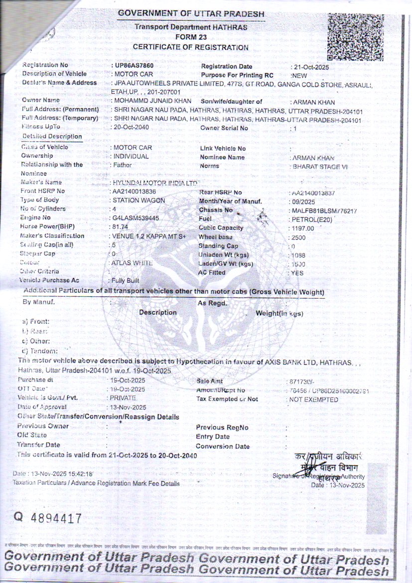 Reg. No : UP86AS7860